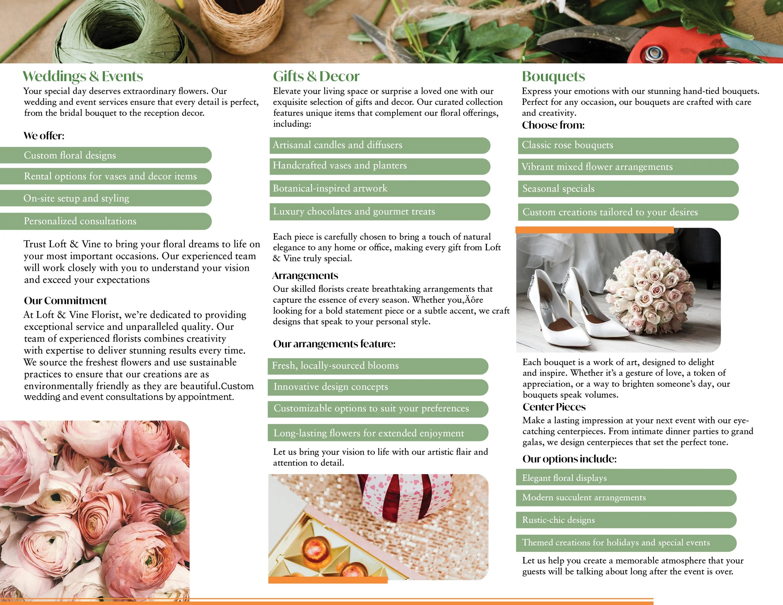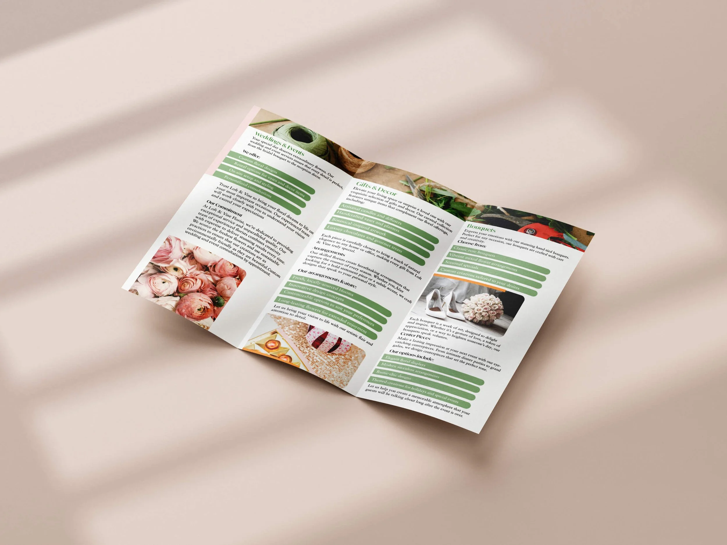 This project involved designing a double-sided tri-fold promotional flyer for Loft & Vine Florist, intended for in-store distribution. A modular grid system organizes content across six panels, creating clear hierarchy and a smooth reading flow as the piece is folded and unfolded. Careful font pairing and typographic hierarchy emphasize key information, while varied type weights support clarity and consistency. A soft, nature-inspired colour palette reinforces the brand’s organic identity, and photography is integrated with typography to create balanced layouts, including imagery that spans multiple panels. The final design was created in Adobe InDesign and produced as a full-bleed, print-ready tri-fold brochure.