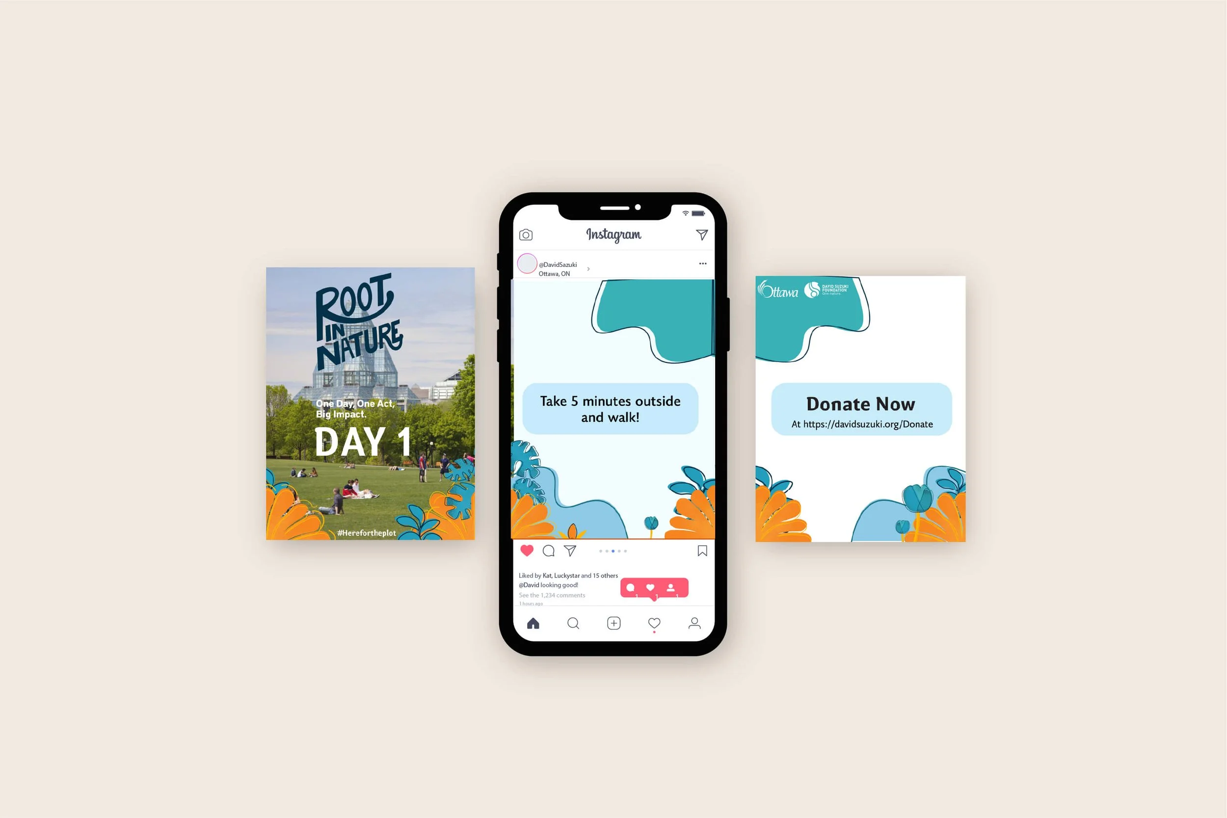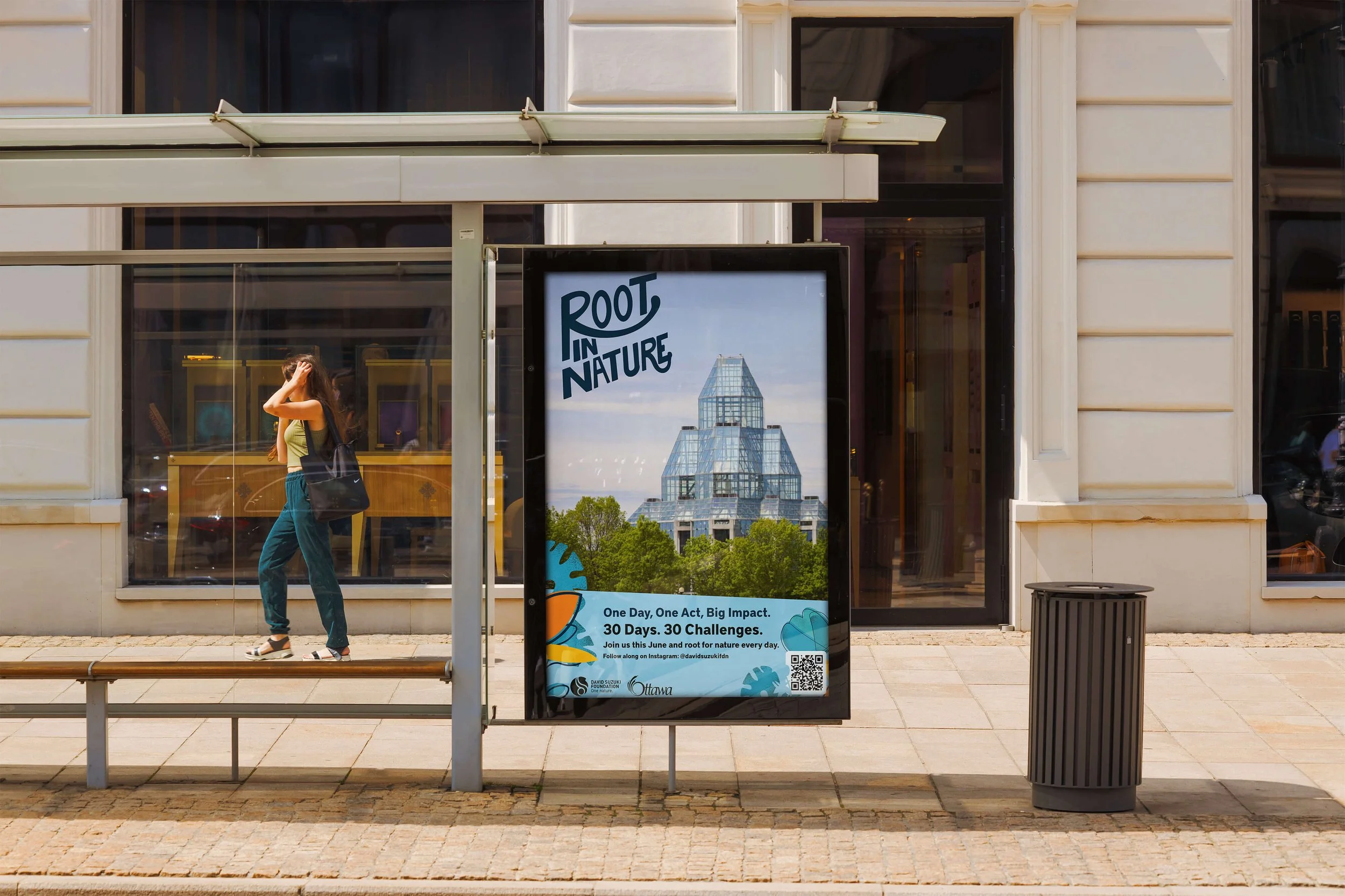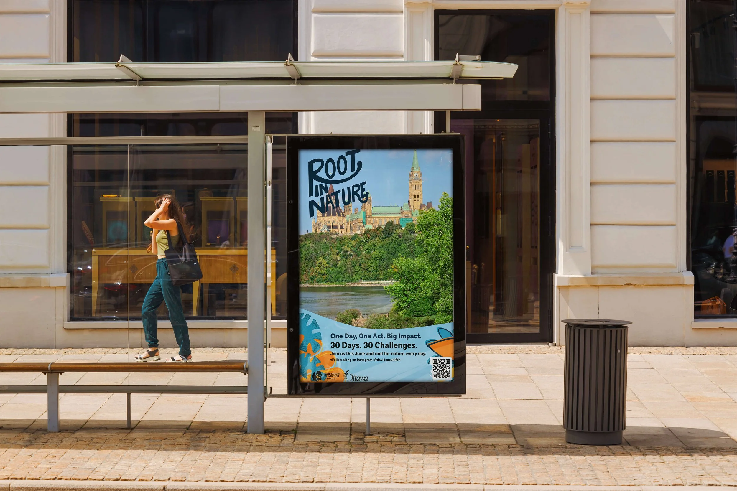 This project involved developing a multi-platform awareness campaign for the David Suzuki Foundation, centered on the concept Root for Nature. The campaign encourages individuals to adopt small, daily eco-friendly actions—such as recycling, spending time outdoors, or shopping second-hand—while fostering a stronger connection to local environments and community spaces. Designed with a focus on Ottawa, the concept highlights nearby parks and integrates location-based suggestions to make participation feel immediate and accessible. The visual system was carried across bus posters, a social media campaign, and a printed calendar, creating a cohesive experience across both physical and digital platforms. Bright, inviting visuals and clear messaging support engagement, while interactive and shareable content encourages ongoing participation. Targeting teens to young adults interested in sustainability, wellness, and outdoor activities, the campaign positions environmental action as approachable, social, and easily integrated into everyday routines.