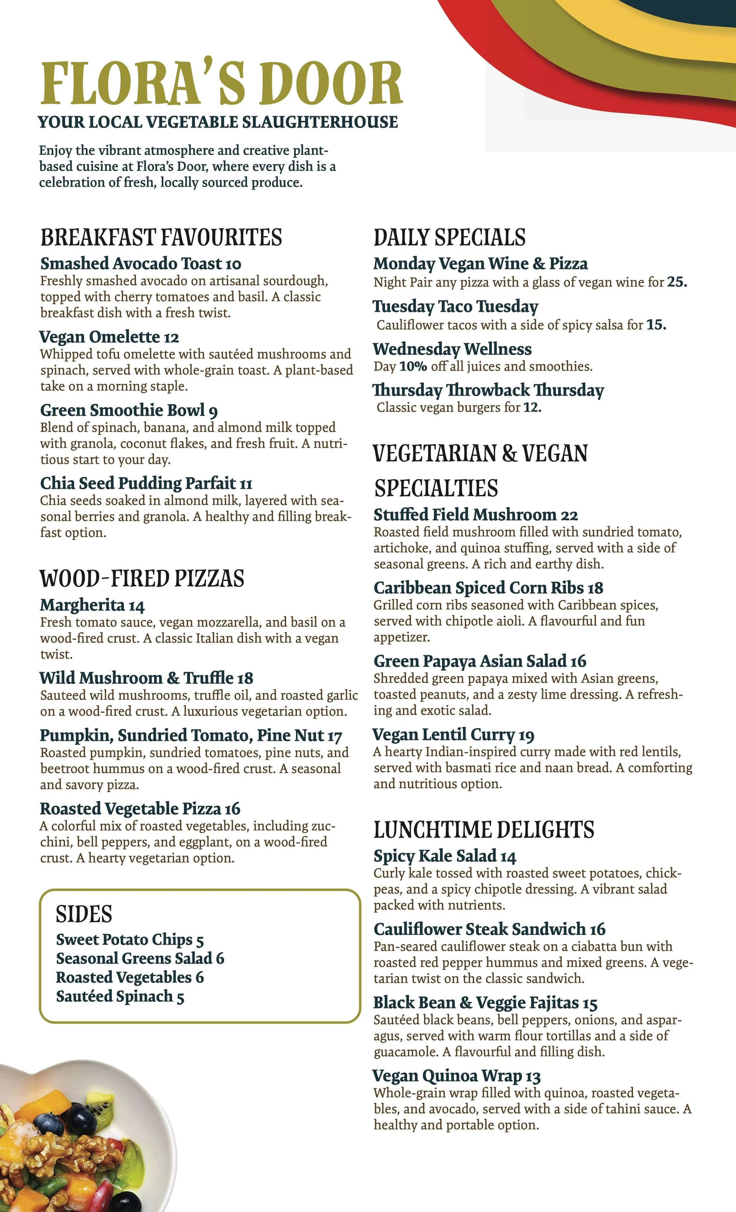 Menu design for floras door a vegan restaurant (student project).